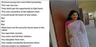 കശ്മീരിലെ സൈന്യത്തെ വിമര്ശിച്ചു ഫെയ്സ്ബുക് പോസ്റ്റിട്ട അധ്യാപികയ്ക്കെതിരെ രൂക്ഷമായ സൈബര് ആക്രമണവും വധ ഭീഷണിയും